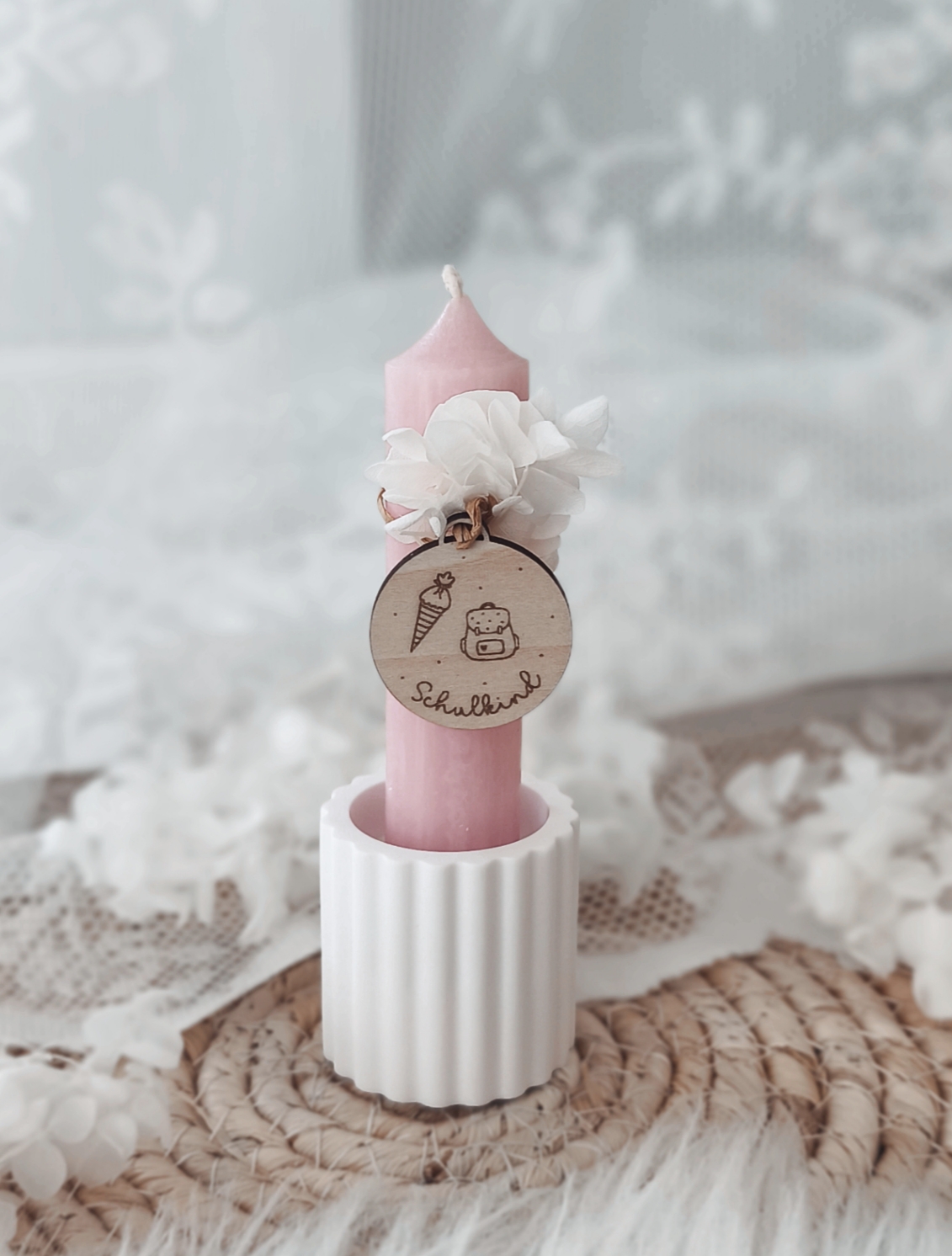 Dieser hochwertige Kerzenhalter mit passender Stabkerze und einem Holzanhänger mit der Aufschrift SCHULKIND ist das perfekte Präsent zum Schulanfang.