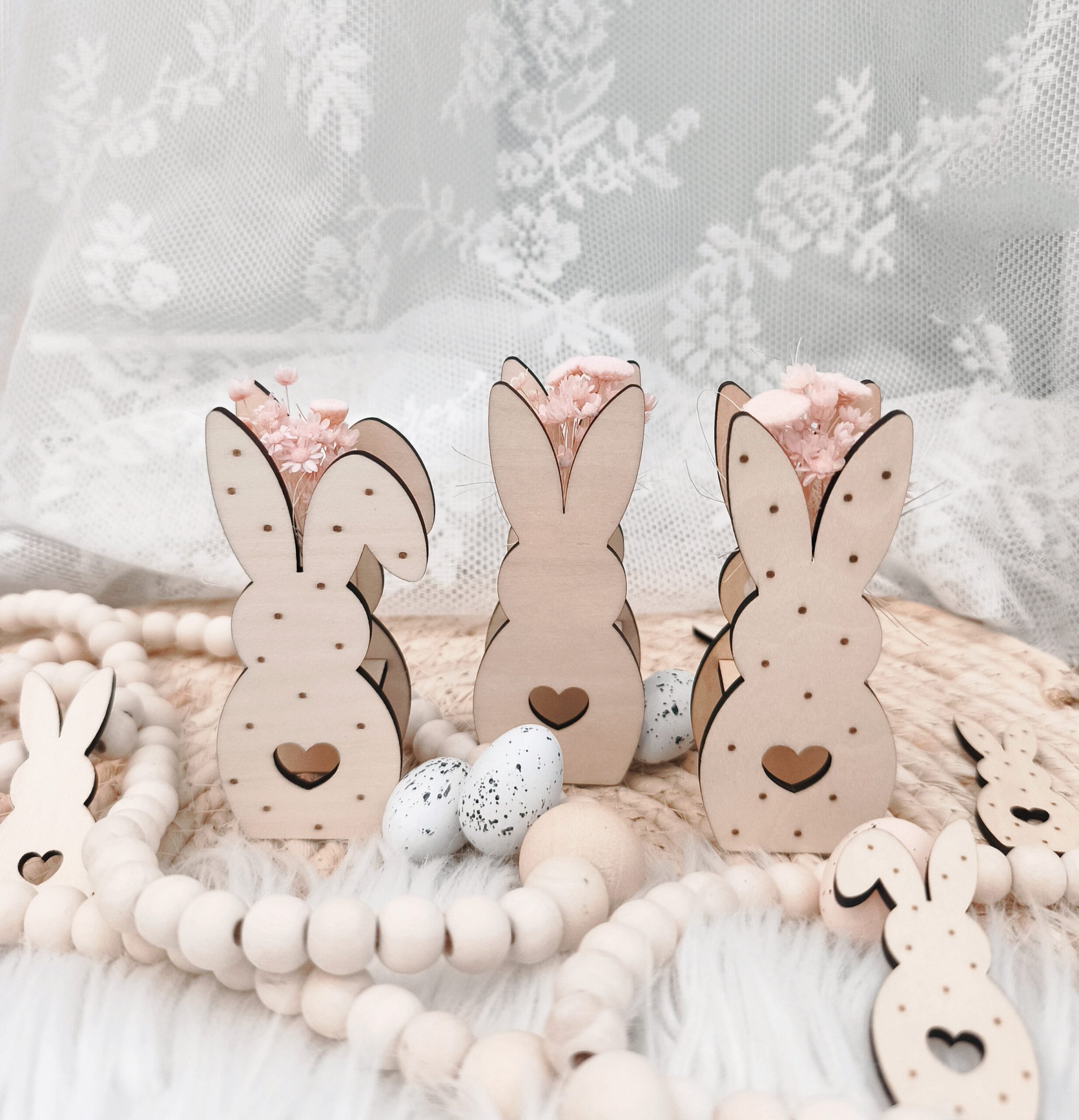 Bewahren Sie den Hasen an einem trockenen und sicheren Ort auf, um Schäden durch Feuchtigkeit zu vermeiden. Hohe Luftfeuchtigkeit oder direkte Sonneneinstrahlung könnten sowohl das Holz als auch die Trockenblumen beschädigen.